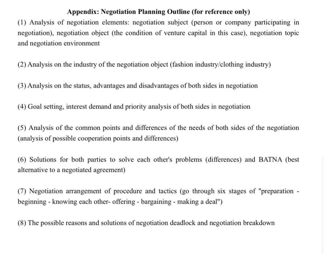 在策划书中,除了Appendix给出的参考部分,我们还在最后增加了一个我们自己的附件部分,同样命名为Appendix。在这一部分,我们添加了一些谈判时可能的佐证材料,例如股权加速兑现条款、反稀释条款、可能的法律文书、以及对赌协议等等。这些附件不仅能帮助我们在内部讨论时能更清晰地理顺思路,同时也为谈判过程中的复杂情况提供了可靠的依据。如果在谈判过程中对方有任何疑问或感到困惑,我们可以立即出示这些材料来支持我们的论点,确保谈判顺利进行。
